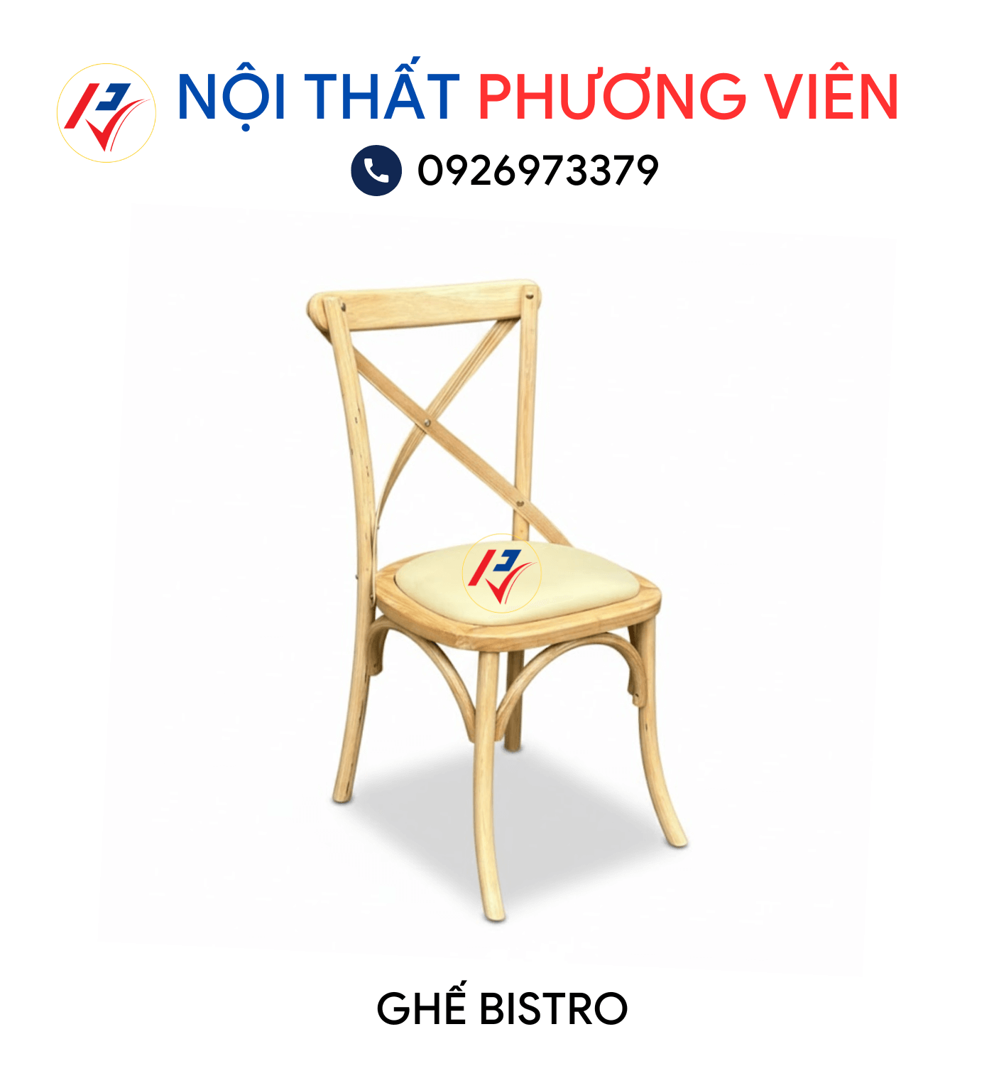 Ghế Bistro có điểm nhấn đặc trưng với phần tựa lưng uốn cong và hai thanh gỗ bắt chéo hình chữ X đầy nghệ thuật.