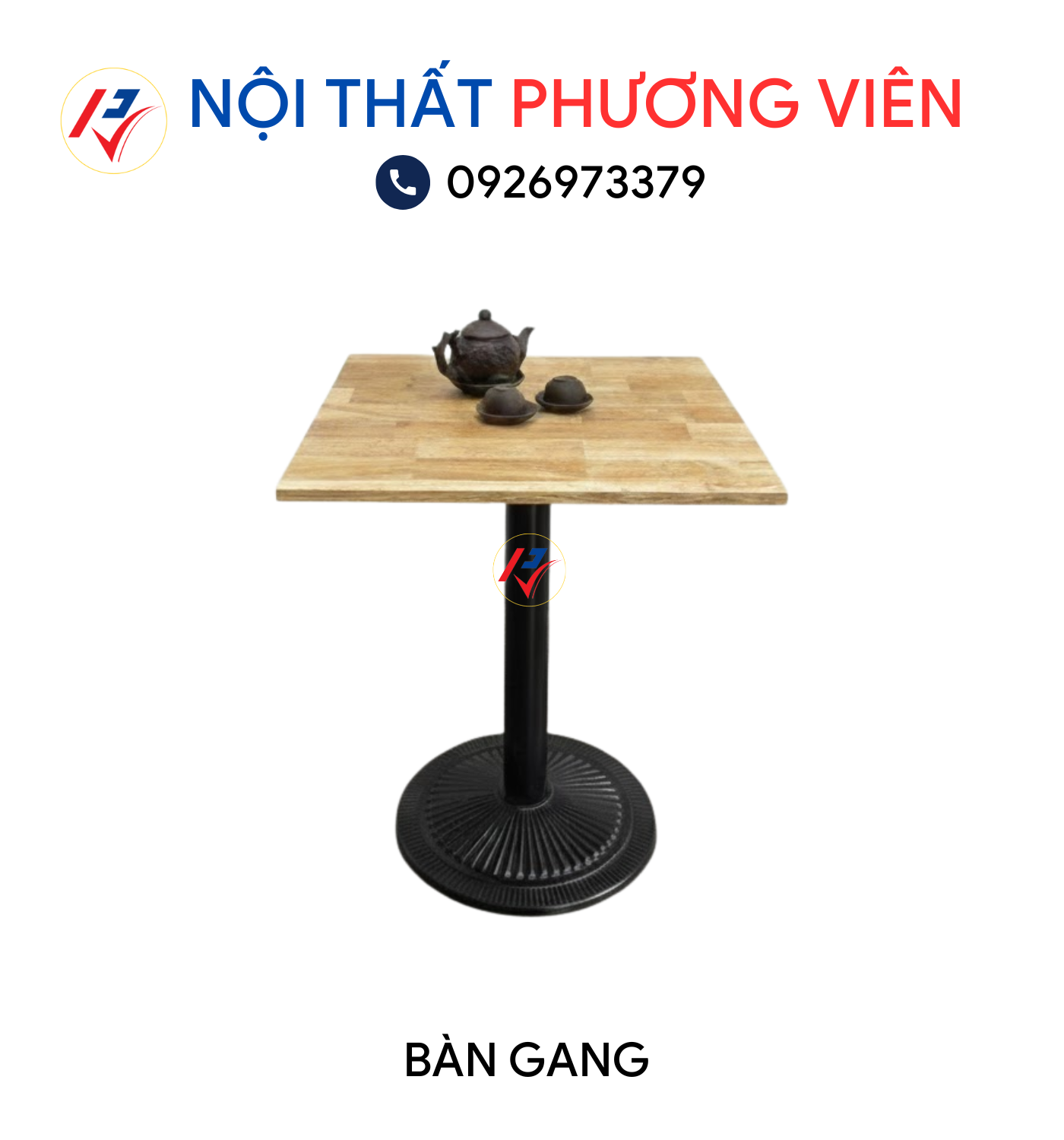 Chân bàn gang mang họa tiết mỹ nghệ hoặc thiết kế trụ tròn đơn giản, tạo cảm giác vừa mạnh mẽ vừa sang trọng. Mặt vuông nhỏ gọn, dễ sắp xếp và không chiếm nhiều diện tích.