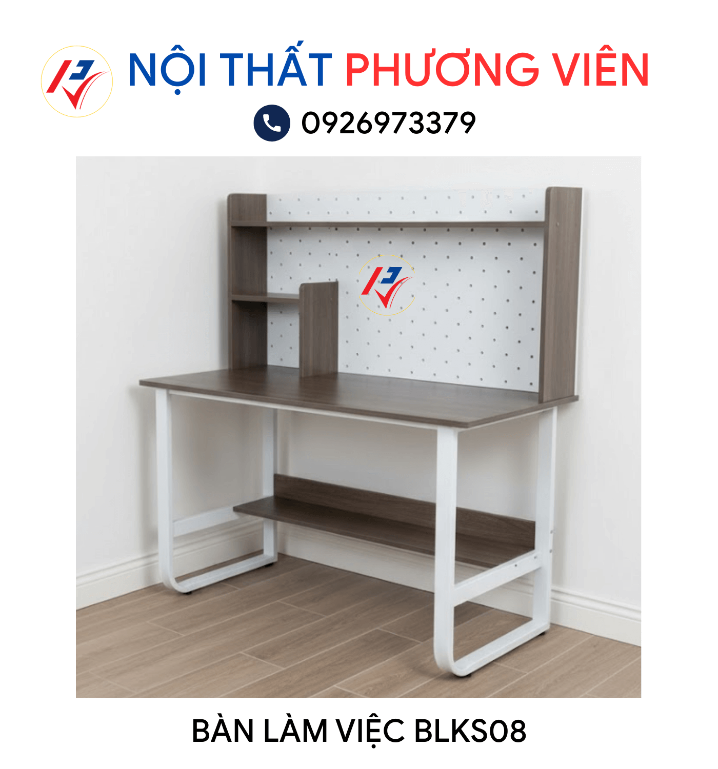 Bàn làm việc gỗ MDF BLKS08 với thiết kế “3 trong 1” hiện đại: Bàn làm việc + kệ sách + pegboard tiện dụng ngay trong một sản phẩm.