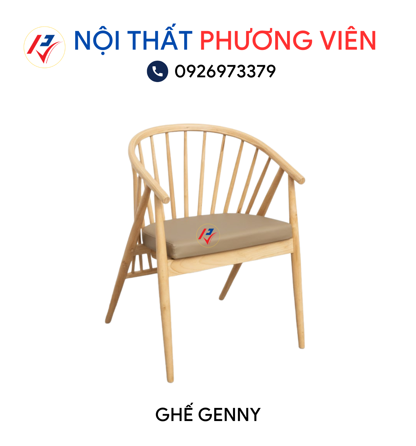 Ghế Genny duyên dáng, với khung gỗ tự nhiên, lưng ghế được tạo hình bằng các thanh nan gỗ xếp dọc bán nguyệt ôm cong mềm mại theo lưng người ngồi.