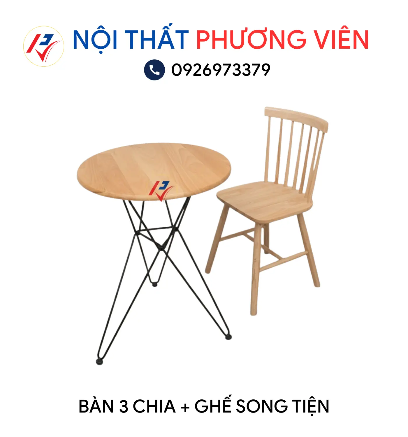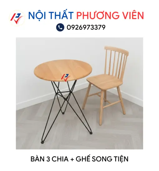 Bề mặt bàn được phủ lớp sơn PU mờ cao cấp, giúp tăng độ bền, chống thấm nhẹ và giữ được màu sắc tự nhiên đặc trưng của gỗ.Kích thước bàn 3 chia + Ghế song tiện này thường bao nhiêu?Bàn 3 chia kích thước: 60cmx60cmx75cm Ghế song tiện: 40cmx40cmx45cm-83cm