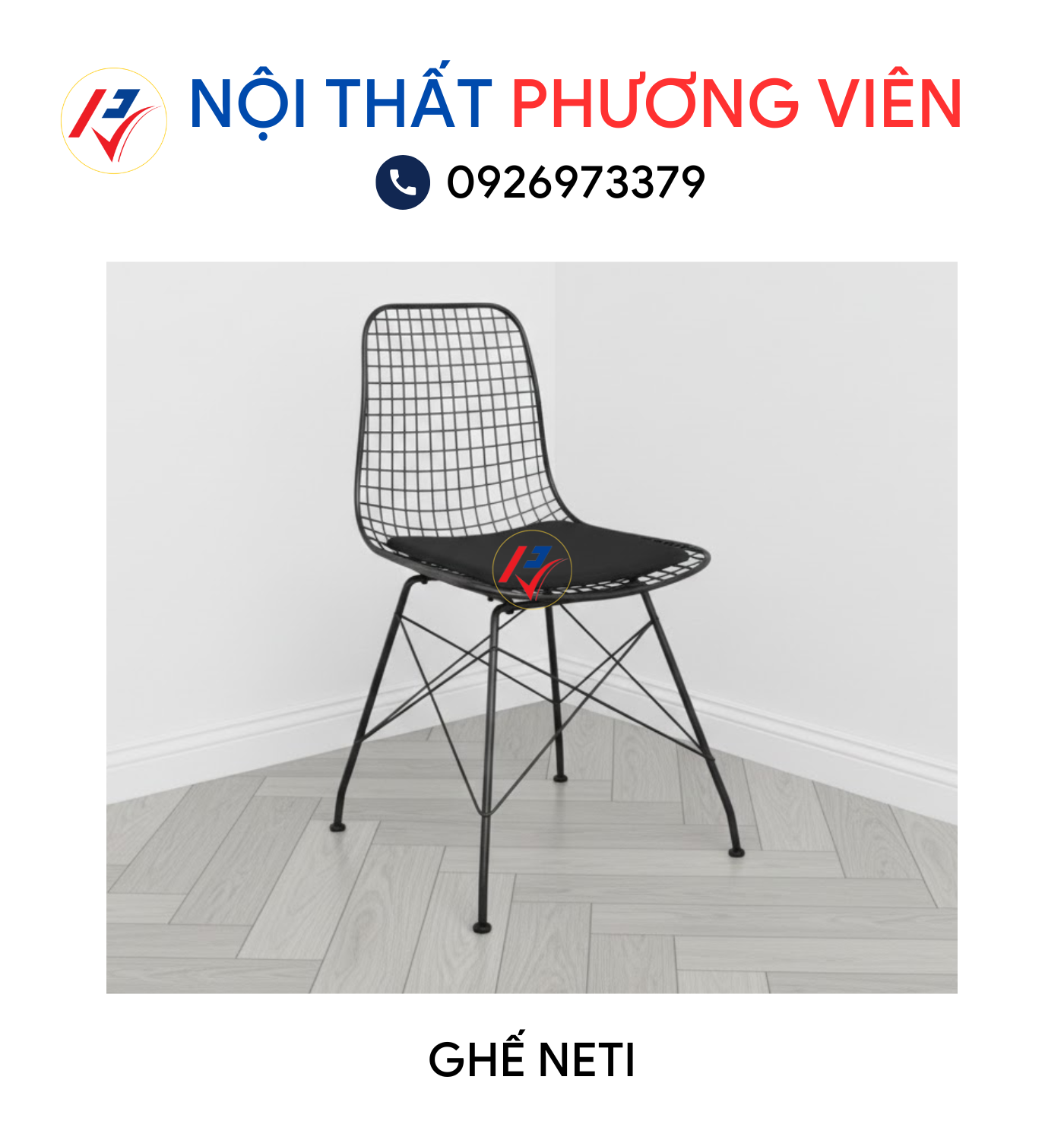 Ghế Neti được thiết kế từ những thanh sắt mảnh, uốn cong mềm mại, tạo thành một mặt lưới vuông đều đặn.