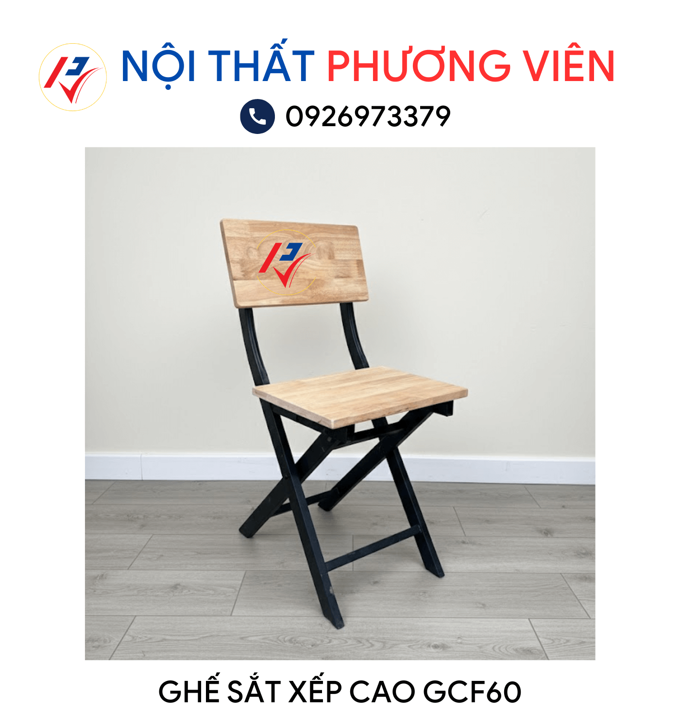 Phần lưng tựa được thiết kế hơi ngả ra sau, tạo điểm tựa tự nhiên cho cột sống, đồng thời sử dụng gỗ đồng bộ với mặt ngồi để tạo sự hài hòa trong thiết kế. Chân ghế sắt xếp cao được thiết kế theo dạng chữ X, dễ dàng xếp gọn chỉ trong vài giây mà không cần thao tác phức tạp.