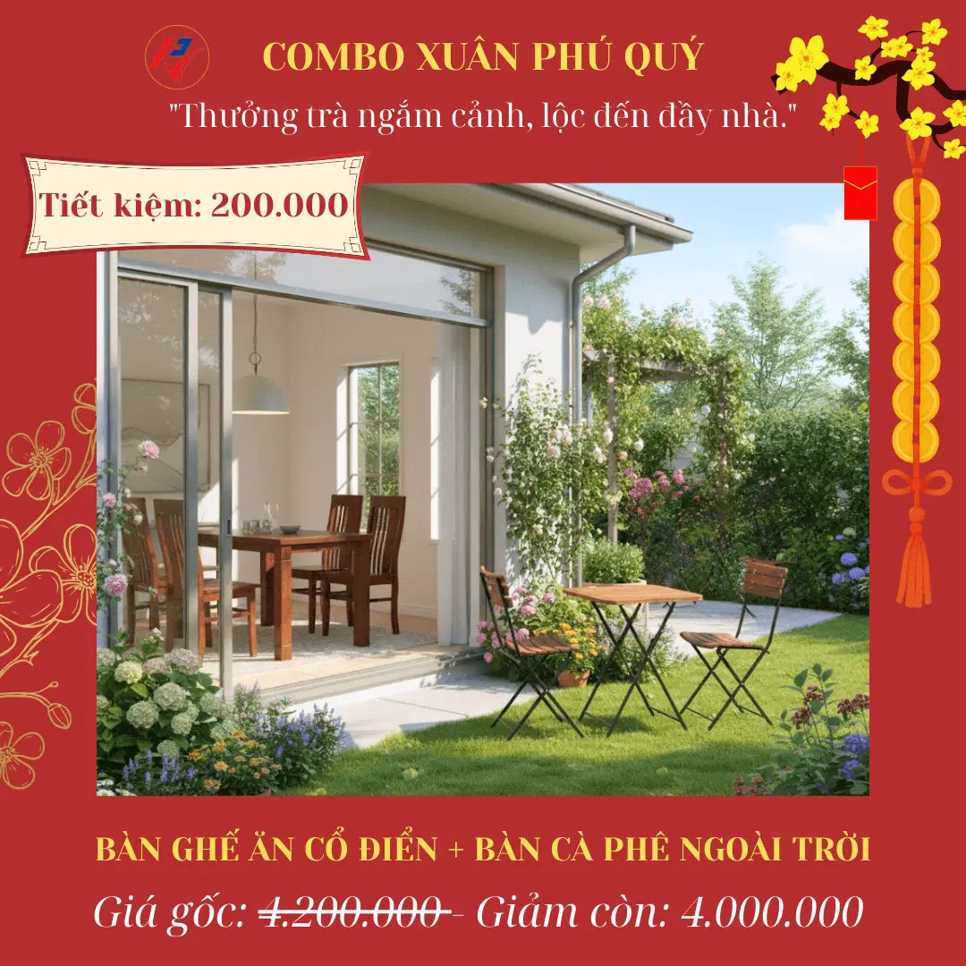 | 4 | Xuân Phú Quý | Bàn ăn Cổ điển + Bàn Ghế Patio | ~~4.200.000đ~~ | 4.000.000đ | 200.000đ |