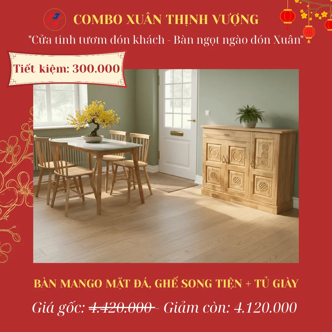 | 6 | Xuân Thịnh Vượng | Bàn Mango mặt đá + Ghế song tiện + Tủ giày | ~~4.420.000đ~~ | 4.120.000đ | 300.000đ |